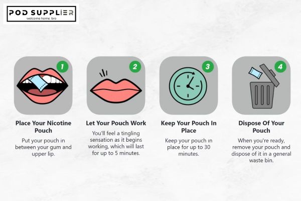 Bước 2: Đặt túi nicotine vào giữa nướu và môi trên của bạn. Vị trí phổ biến nhất là phía trên răng cửa hoặc ở một bên miệng.